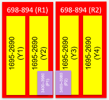 | Frequency bands, MHz | 698-806 | 806-894 | 1695-1880 | 1850-1990 | 1920-2180 | 2300-2360 | 2496-2690 |