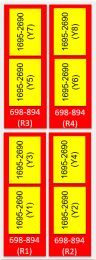 12 sets of radiating arrays R1: 698-894 MHz R2: 698-894 MHz R3: 698-894 MHz Y1: 1695-2690 MHz Y2: 1695-2690 MHz Y3: 1695-2690 MHz Y4: 1695-2690 MHz Y5: 1695-2690 MHz Y6: 1695-2690 MHz Y7: 1695-2690 MHz Y8: 1695-2690 MHz |
