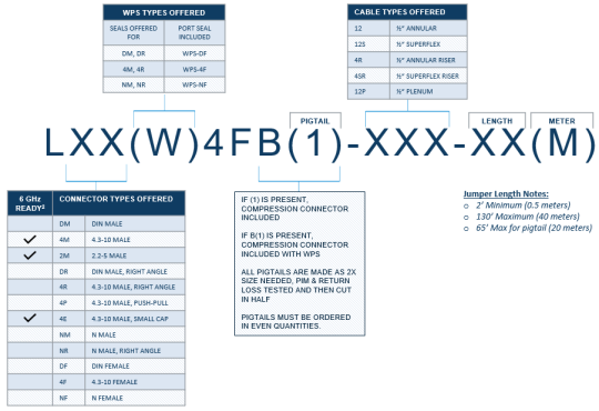 | Both the 1/2" and 1/4" Superflex factory jumpers are available from JMA. Use the nomenclature below to configure the 1/2" annular jumpers for your application. Note the "B" represents the unique configuration required for a 1/4" to 1/2" weatherproofed connection. The 1/4" Superflex jumpers can be configured using the nomenclature found on the 1/4" Superflex jumper datasheet found here. |