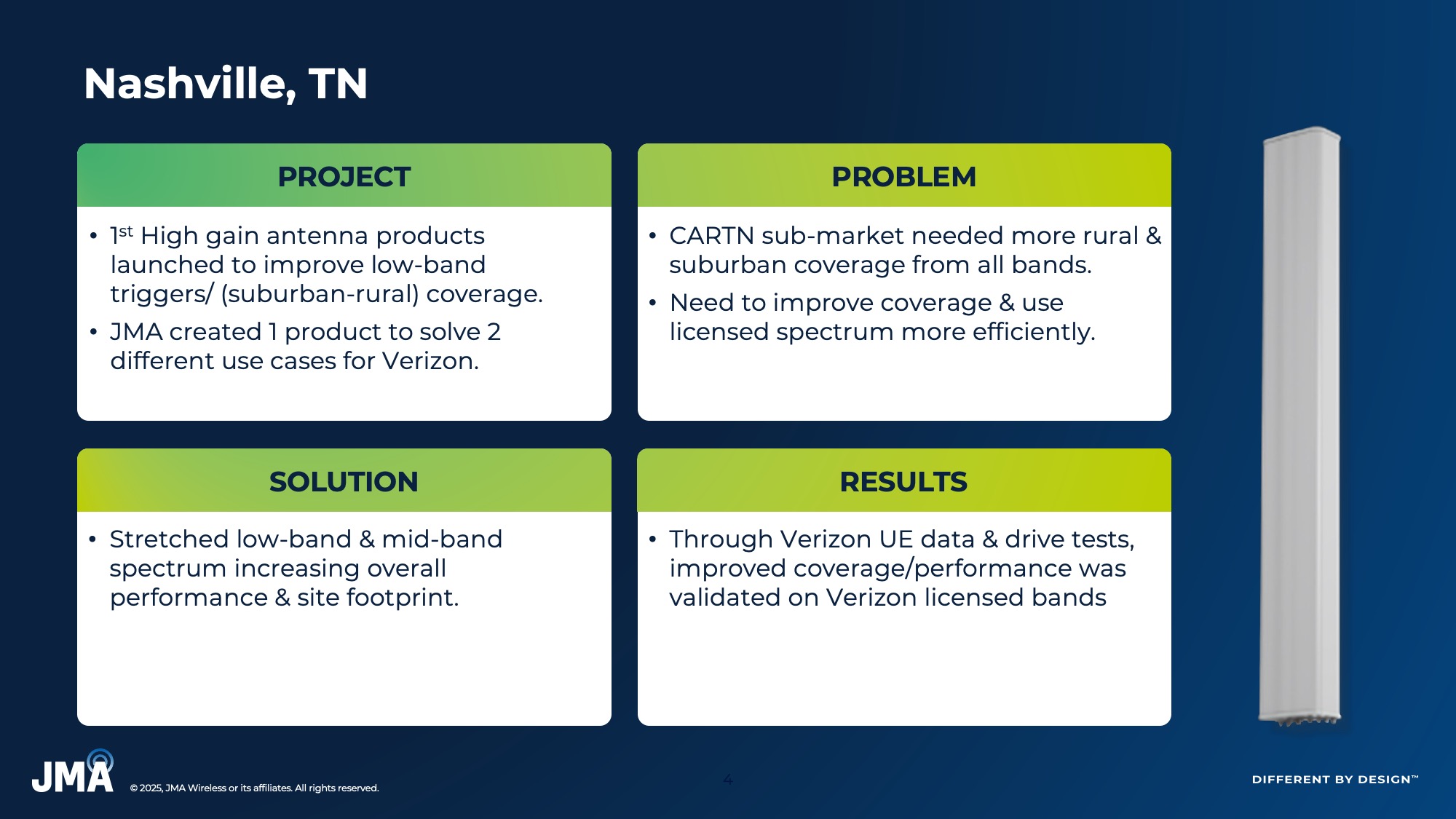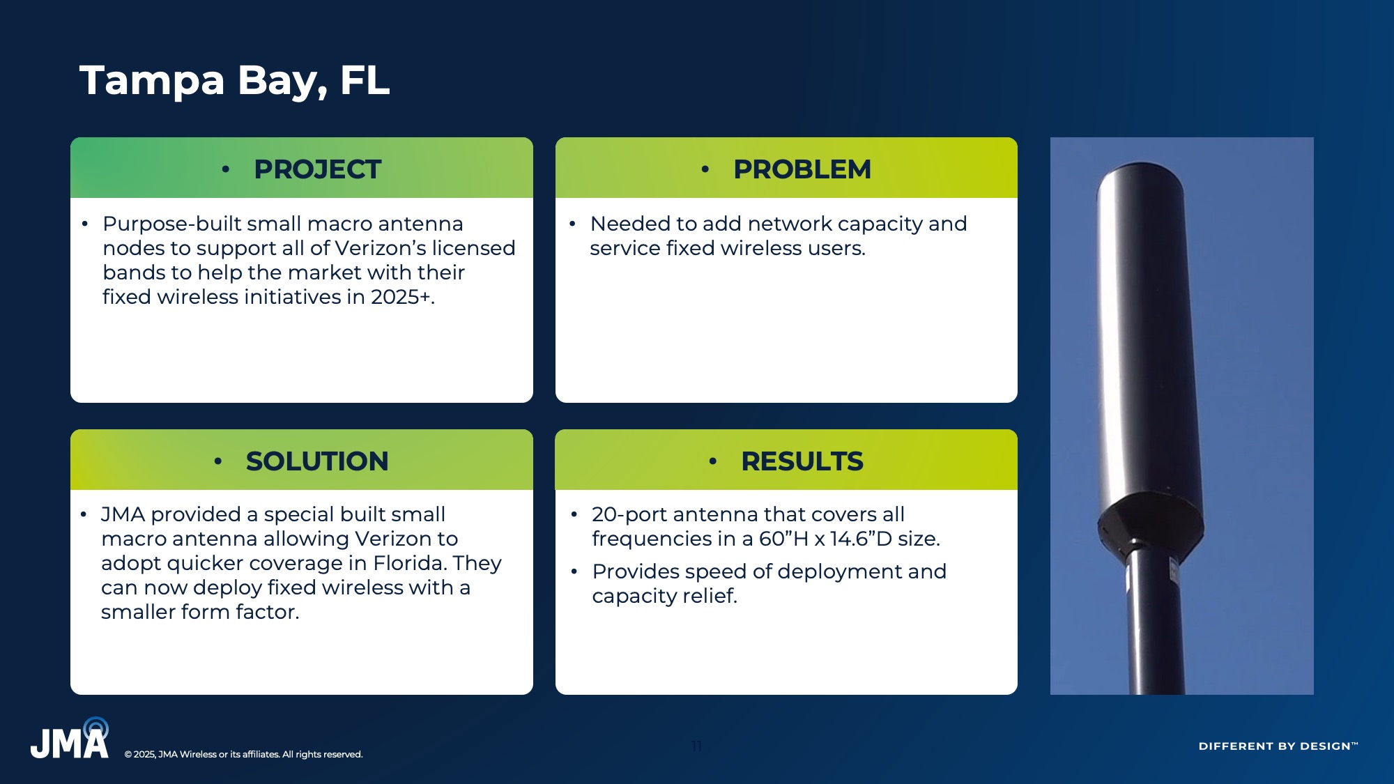 JMA supports the advancement of Verizon’s next-generation network and can help improve network performance with our high-efficiency macro antennas. Our ultra-high gain antennas (FHG) can help reduce capacity triggers and increase network coverage which means more coverage, more capacity and superior in-building penetration.
